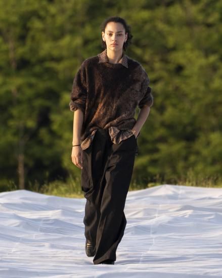 キッドモヘヤの糸と、コットンアクリルの糸2種類の糸を使用し、違う糸を使用することで色ごとに起毛が出るところと出ない部分をわざと作り、起毛している部分としてない部分で段差が生まれマックス・エルンストの「グラッタージュ」のイメージで作成されたブランドらしい1着です。